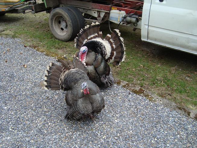The turkeys took us by surprise today with a new (to us) behaviour. We have seen lots and lots of Tom displaying; he is quite obsessive about it. We have not had any eggs yet as far as we know, though Barbara may be hiding them. Today, though, she started doing a male-style display right back at Tom - tail erect and fanned, back-feathers all raised and wings pressed down hard to the ground. We have no explanation for this. The presence of the 'strangers' (our tree guys) and their big noisy shredder/chipper may have had something to do with it.