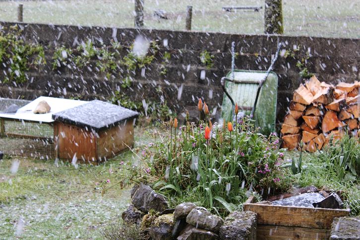 That is just the ancient memory. The up to date use is a comment on the wry Irish take on the weird weather that we have had this week - that you get all four seasons in the same day - rain, hail and snow, drizzle and then bright sunshine with blue skies and puffy cumulus cloud. The coat, hat and gloves you put on to counter the 'winter' are suddenly way too warm as the sun comes out and the wind dies away, until the next squall. I managed to capture a couple of pics of snow, but snow is notoriously tricky to do justice to falling. You have to try to force the flash to go off to illuminate the nearby flakes, but it was so bright, my various auto settings refused to do that. I had to crop in on bits of dark - an open barn doorway or a grey concrete block wall.