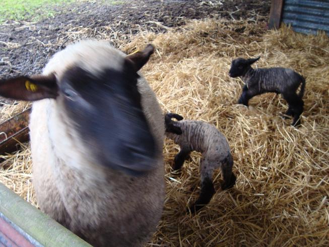 My quick check told me that these were both females, both warm and dry and with nicely full bellies - the contentment was apparently due to an comfortable birth in the dry straw and some quick and efficient suckling of the vital early milk, colostrum. Clever girl(s). Myfanwy had presumably also passed the afterbirth because there was no sign of any hanging around her back end. The lambs are, once again, one dark and one light - we do not seem to be able to do 'proper' white lambs.