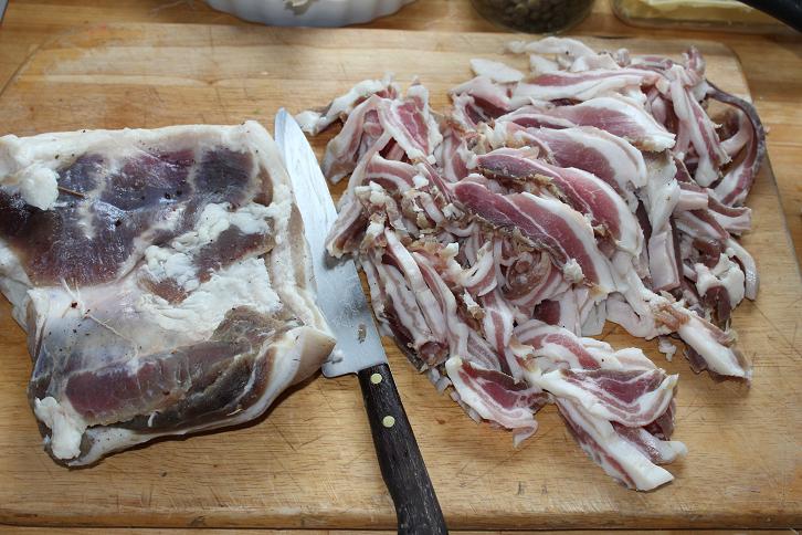 The pork bellies I had salted down and then air dried came ready today, so I was able to de-rind the bellies and then slice the bacon up into 250 g packs of good streaky bacon. We have a cousin visiting at present, so we were able to try out the rashers for a nice breakfast which went down well with all customers. The cousin (Keith) commented that it was the "proper smell of Sunday" he could remember from childhood.