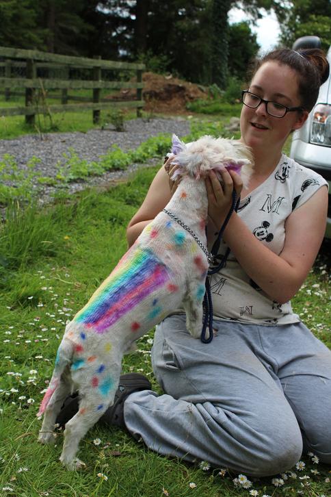 So, Towser got a (golden) lion cut which, once photographed, got all cut off again so that his head and shoulders would be cool and he finished up with a 'Gay Pride' style rainbow and many coloured dots. Poppea got an Irish tricolour on one side and a goal net on the other so she'd be ready for the footie (Euros). Deefer got butterflies on 3 sides and a desert-island palm tree (green leaves, brown tree trunks, golden sand) on her rump.