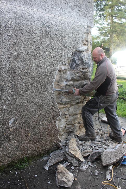 We were not at all sure that the stone would be beautiful, of course. Plenty of the internal walls proved to be a right old mess of concrete blocks, old bricks and re-used rubble. But 'no', we were delighted to find quality stone work with big blocky 'coin' stones at the corners and well bonded rows of good stone throughout. Some of the coins are 13" high and one was a gorgeous black stone which will make quite a feature. We were also delighted with how "handy" (well) the render came away. You can be days chipping away inch by inch. You don't know till you start. The kango-ing, raking out and then wire-brushing were all dusty, messy jobs and my hair felt like a Lego man's one-piece plastic wig by the end. It was pure joy to be able to get into the shower.