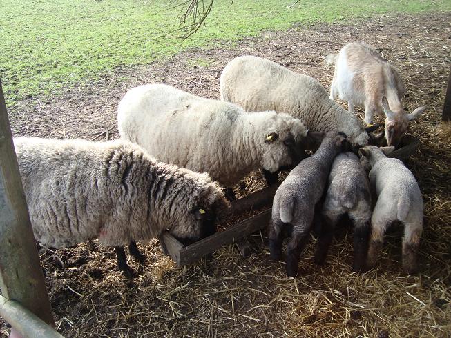 3 of the lambs, nice and stocky now, start to show a healthy interest in the grown-ups' food. |