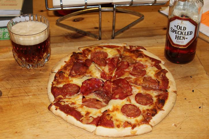 A lazy cop-out day on the home-alone menu - pizza and a beer.